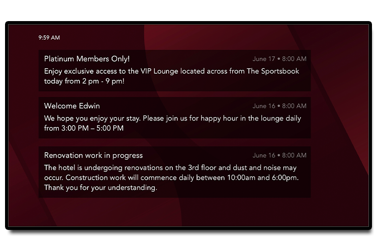 Info can be updated based on real-time inventory or schedules—giving time-based promos for gaming tournaments, open dining experiences, live entertainment happening, and player incentives.