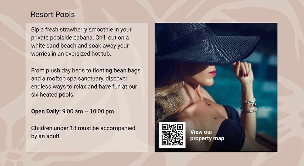 Guests can explore everything your property offers & access details they need (hours, maps, schedules, menus, etc.)