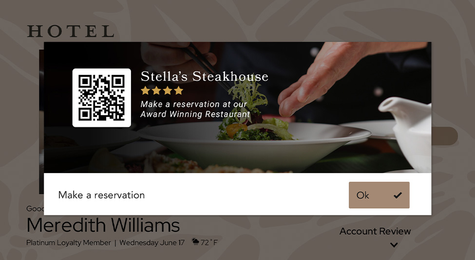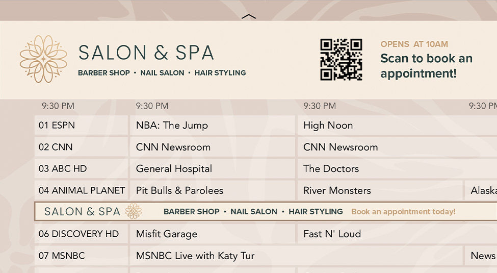 Advertise features & specials at TV turn-on & as guests scroll through the interactive programming guide