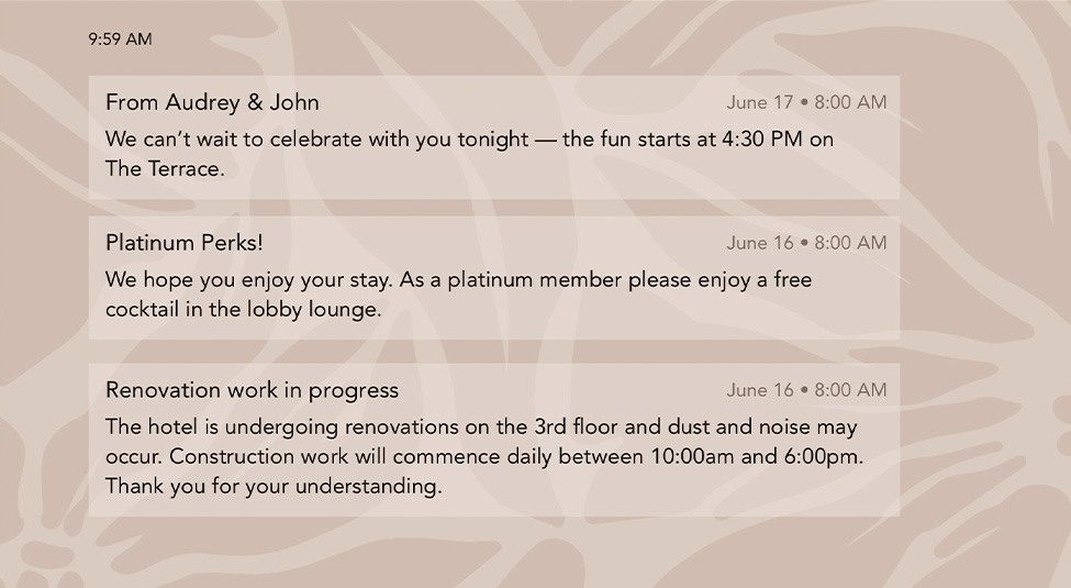 Entice guests into a fully immersive experience by looping up to 20 minutes of property-specific content